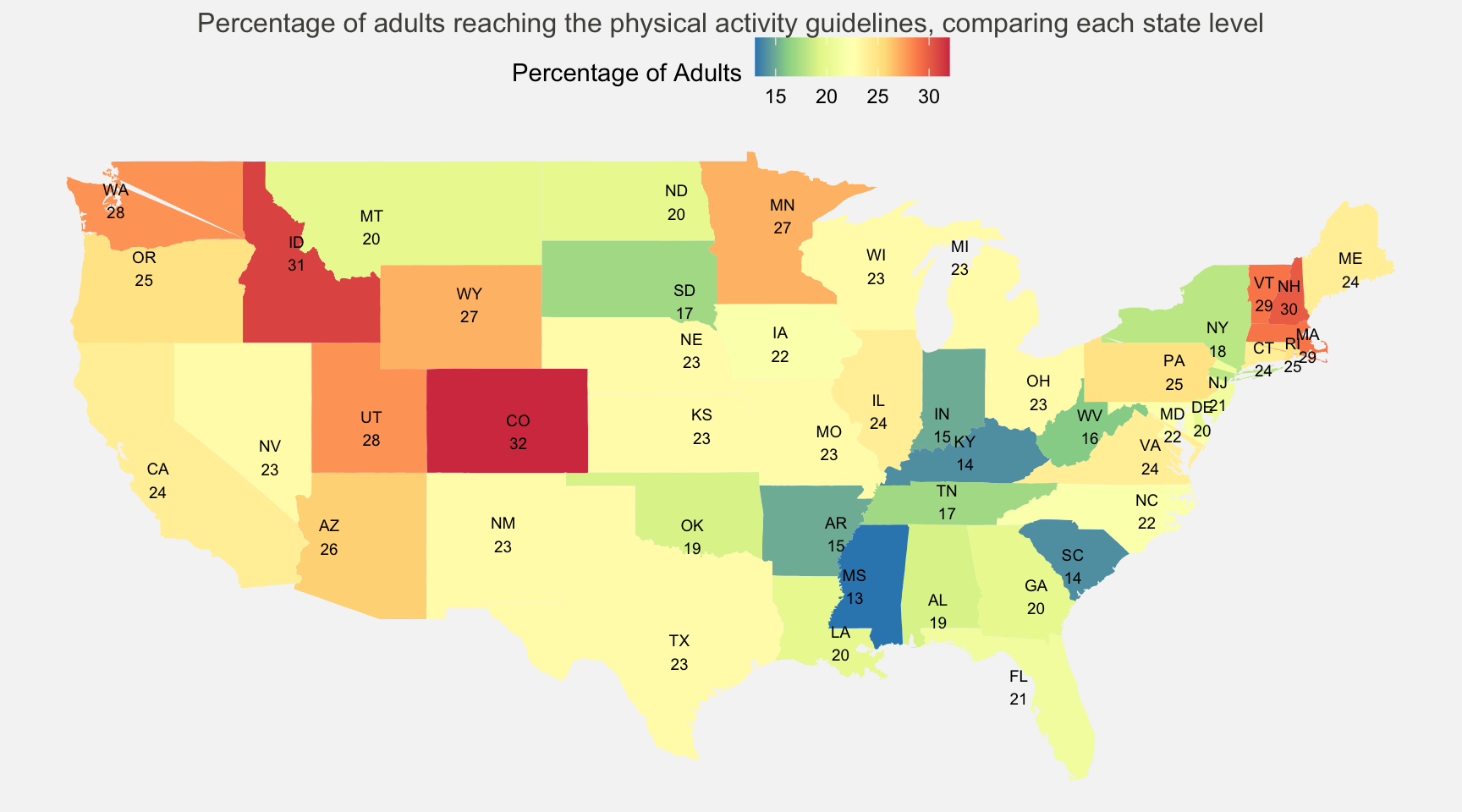 - Percentage of adults who reach the guideline varies by state, where the most active state is Colorado reaching around 32% and Mississippi being the least active state - around 13%, as shown in Figure 4.