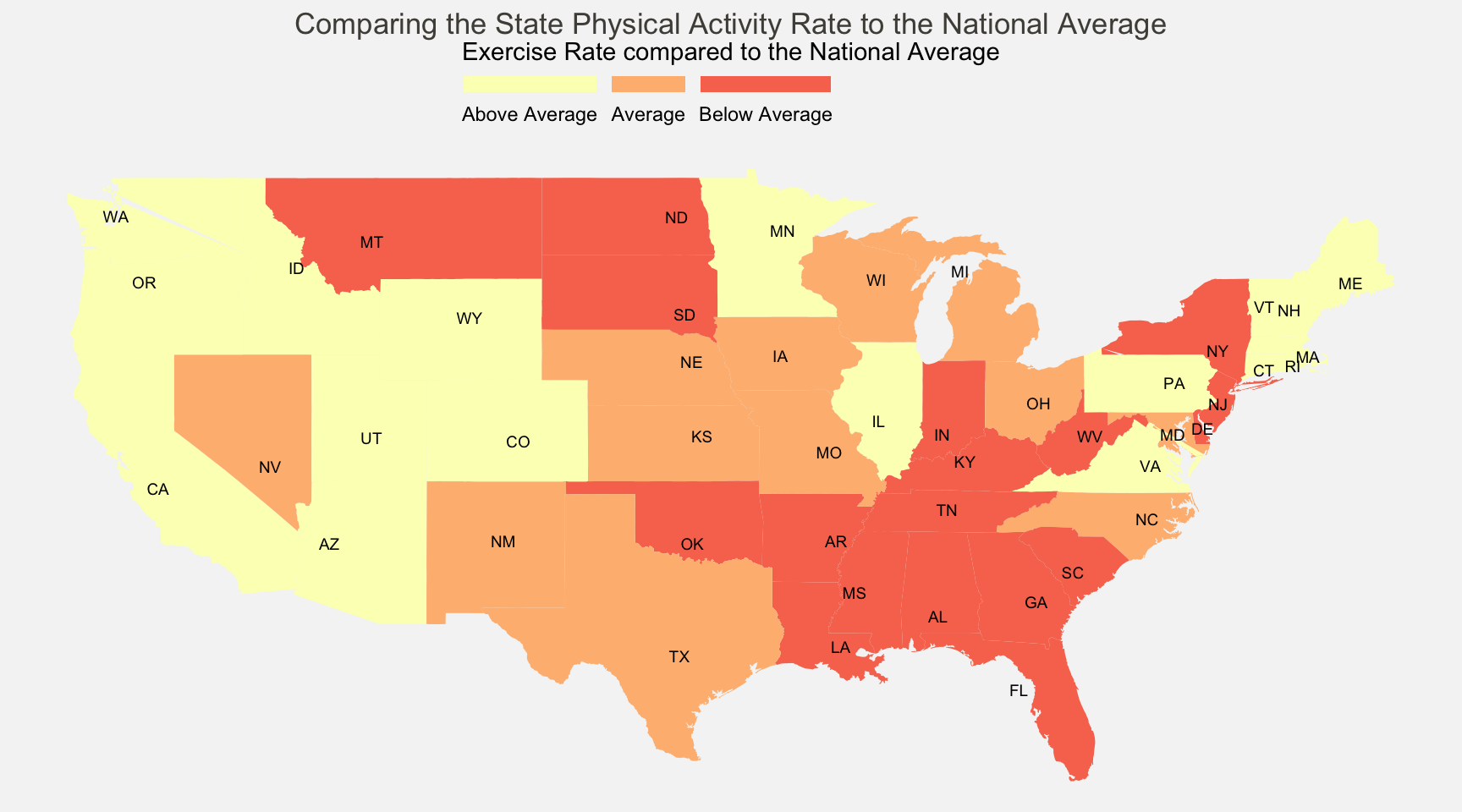 - Geographic differences in each state in the United States among the adults who met the federal physical activity guidelines in the United States.